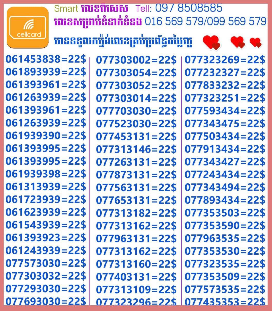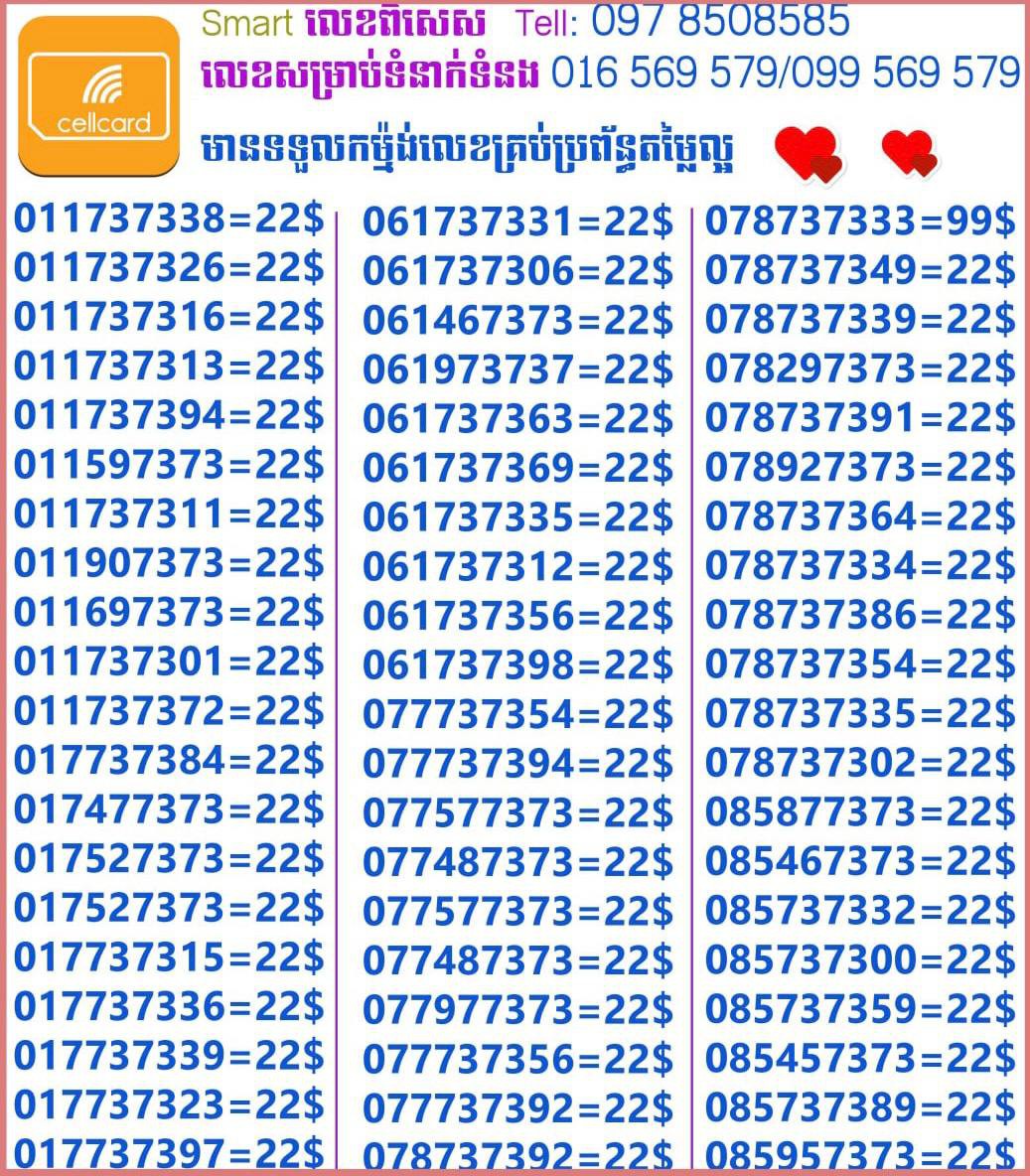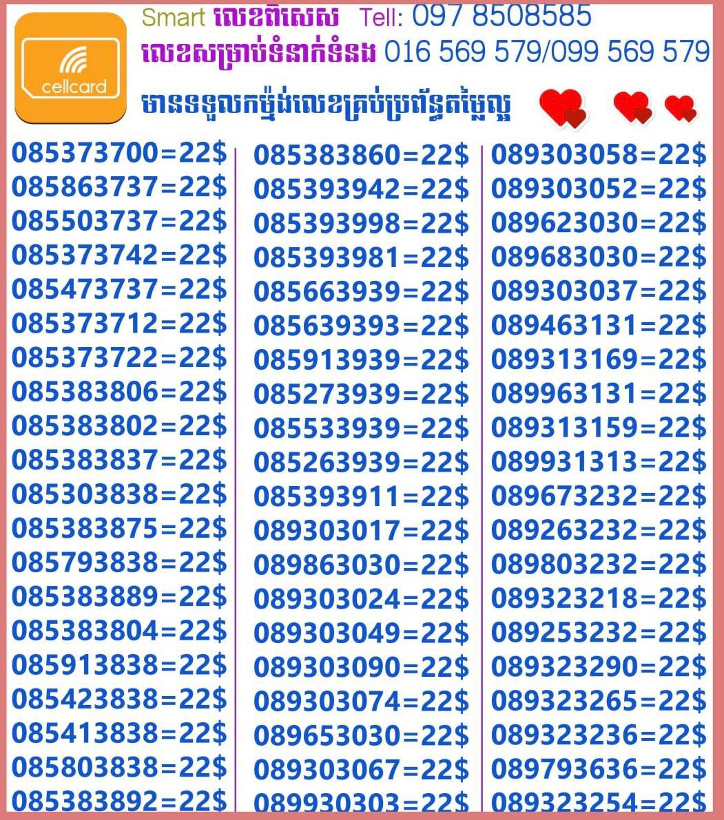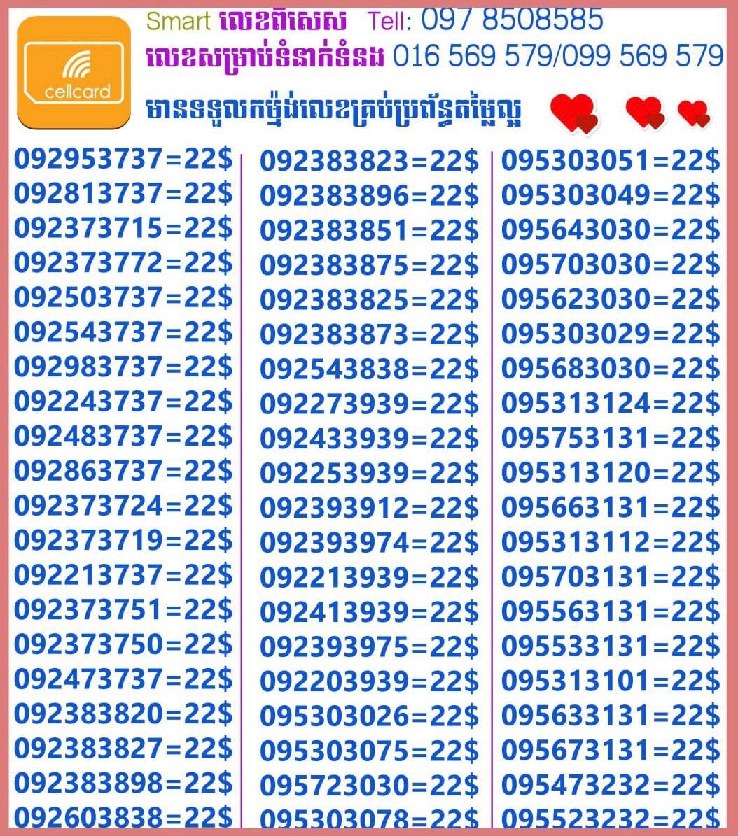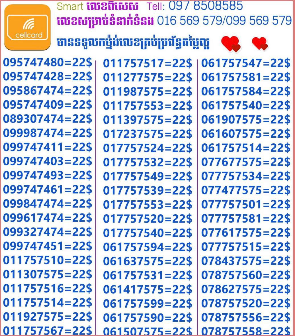 - ស៊ីមទើបមកដល់ថ្មីបងៗ អាចចូលមើលបានតម្លៃសមរម្យ មានលក់ស៊ីមគ្រប់ប្រព័ន្ធអាចចូលមើលបានណាចា លេខពីគូរបីគូរទើបកាត់ចូល Smart+Cellcard +Metfone &Smart + Metfone , Smart + Cellcard