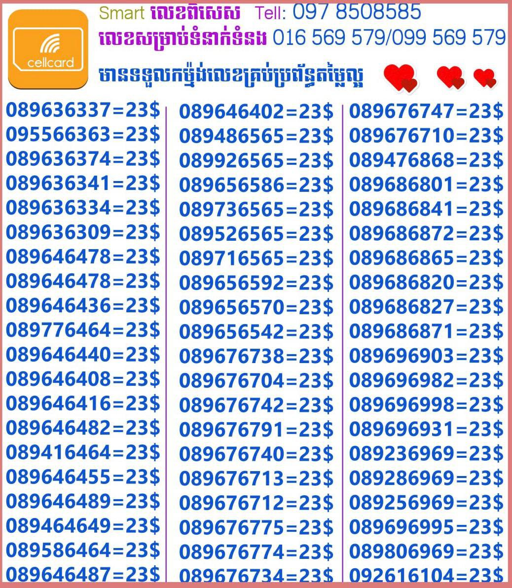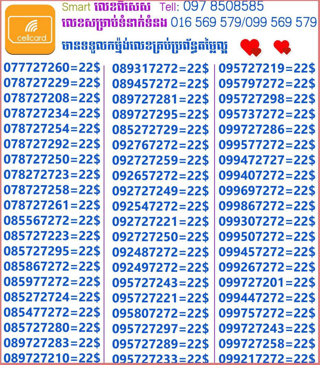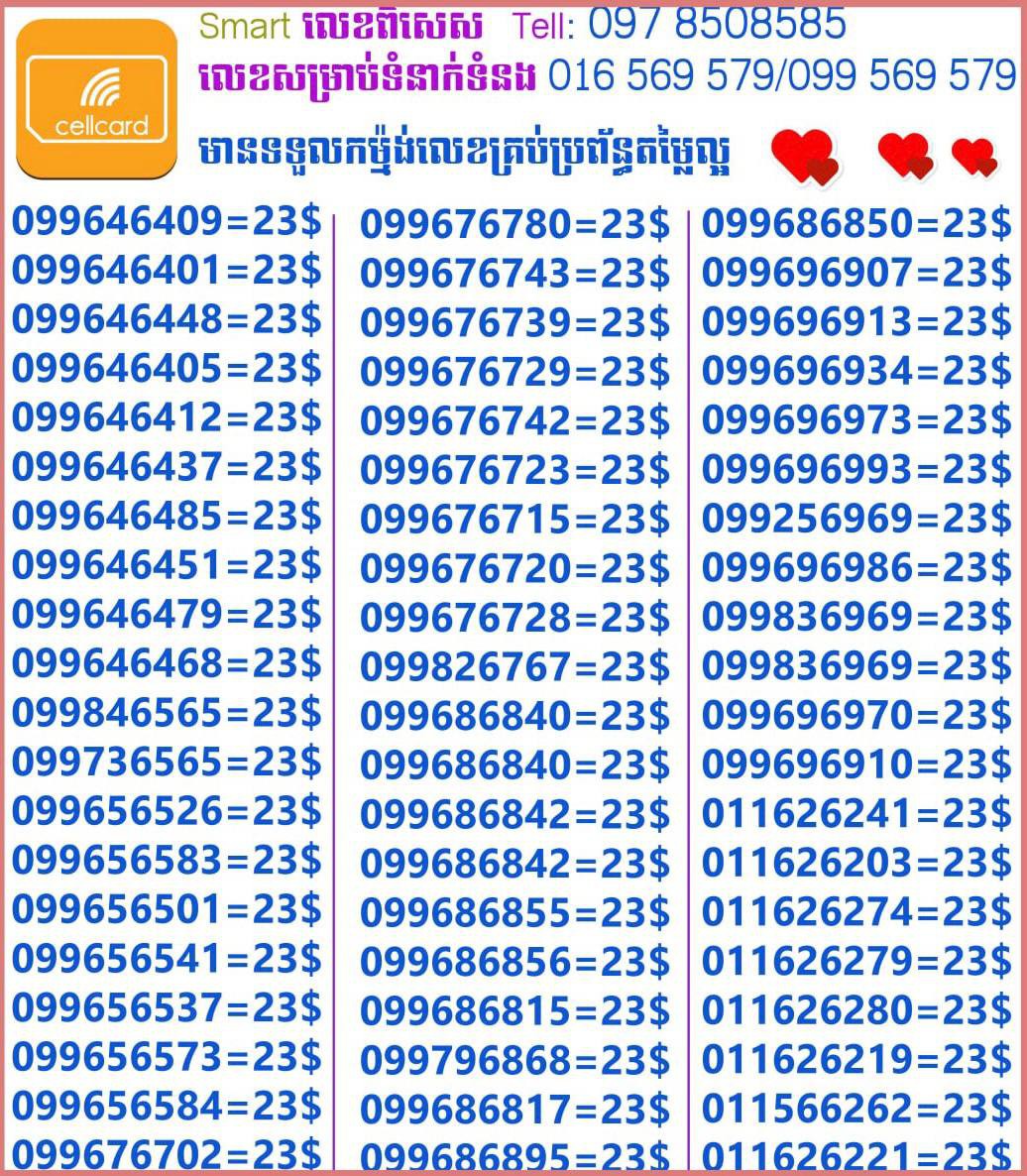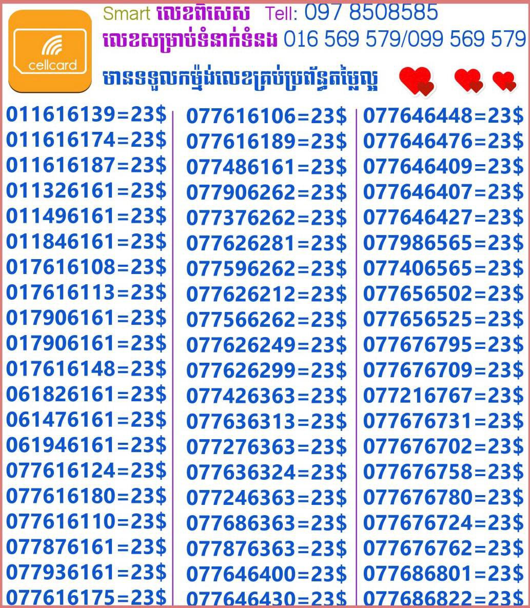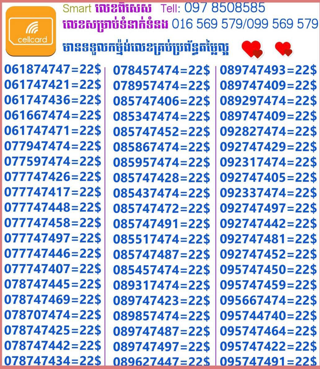 - ស៊ីមទើបមកដល់ថ្មីបងៗ អាចចូលមើលបានតម្លៃសមរម្យ មានលក់ស៊ីមគ្រប់ប្រព័ន្ធអាចចូលមើលបានណាចា លេខពីគូរបីគូរទើបកាត់ចូល Smart+Cellcard +Metfone &Smart + Metfone , Smart + Cellcard
