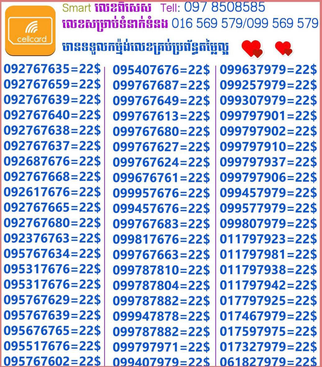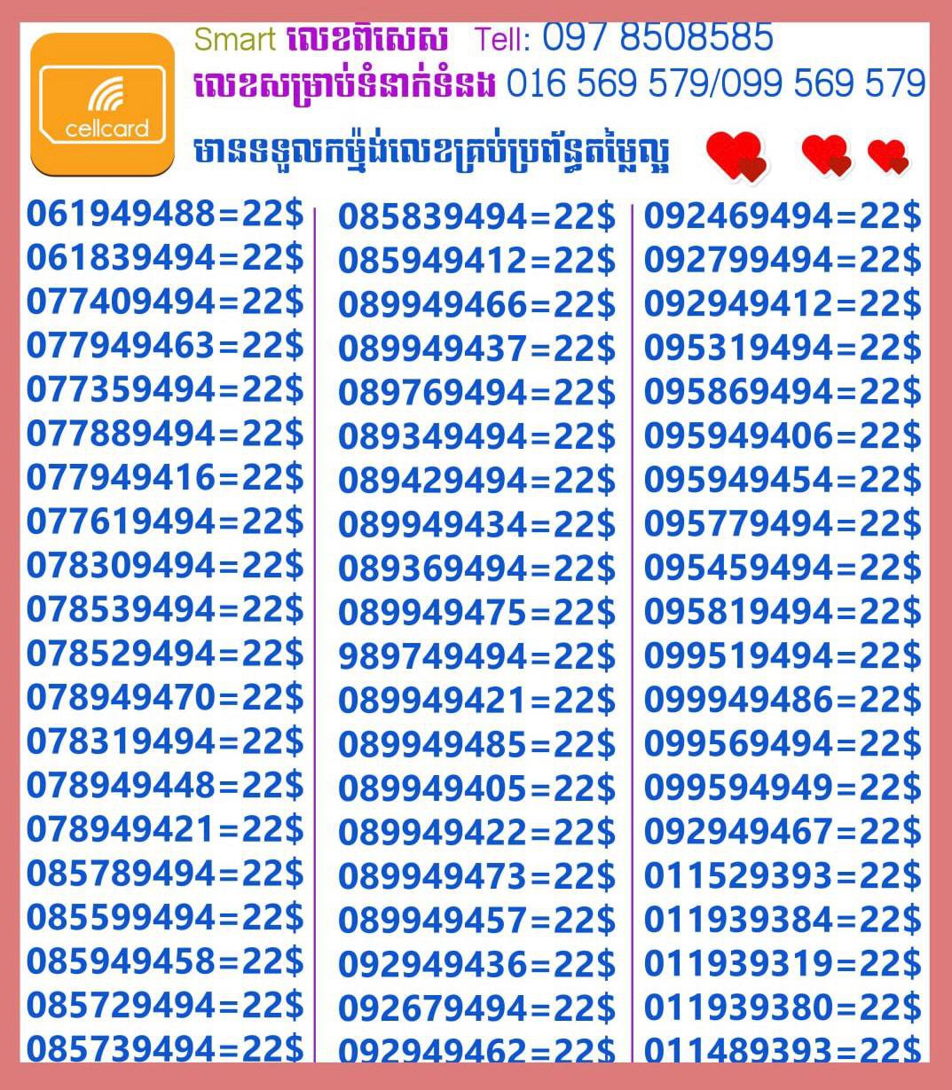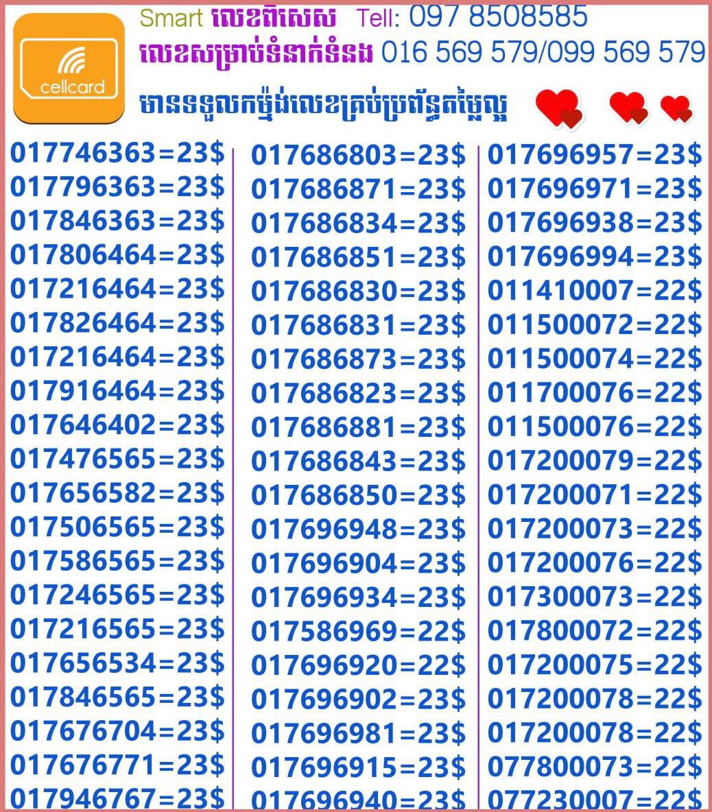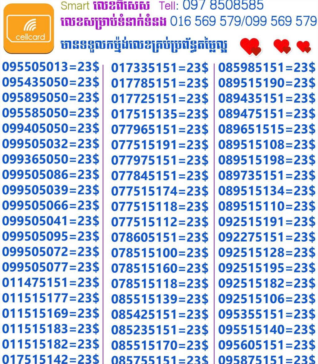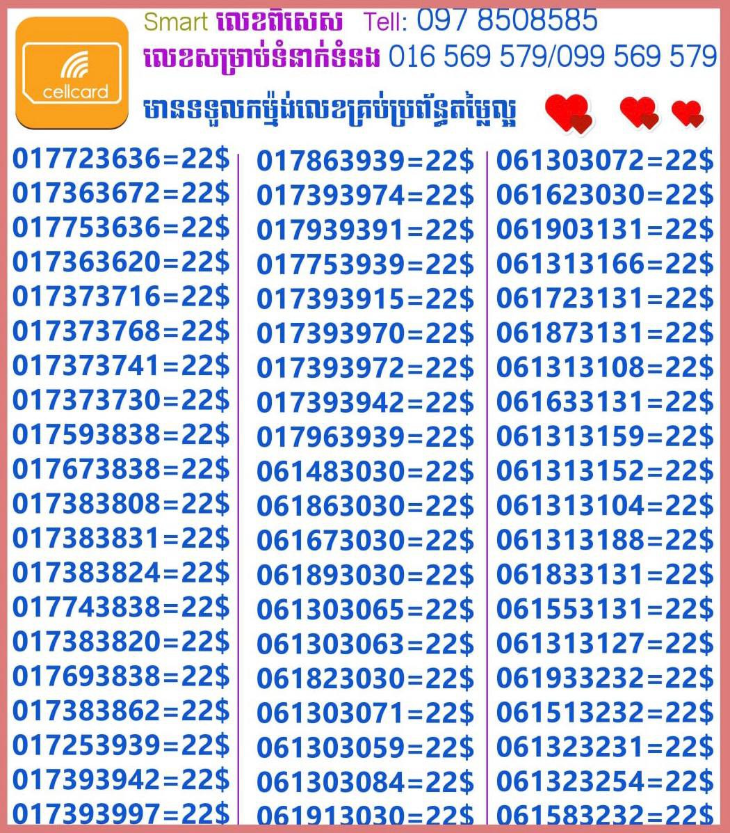 - ស៊ីមទើបមកដល់ថ្មីបងៗ អាចចូលមើលបានតម្លៃសមរម្យ មានលក់ស៊ីមគ្រប់ប្រព័ន្ធអាចចូលមើលបានណាចា លេខពីគូរបីគូរទើបកាត់ចូល Smart+Cellcard +Metfone &Smart + Metfone , Smart + Cellcard