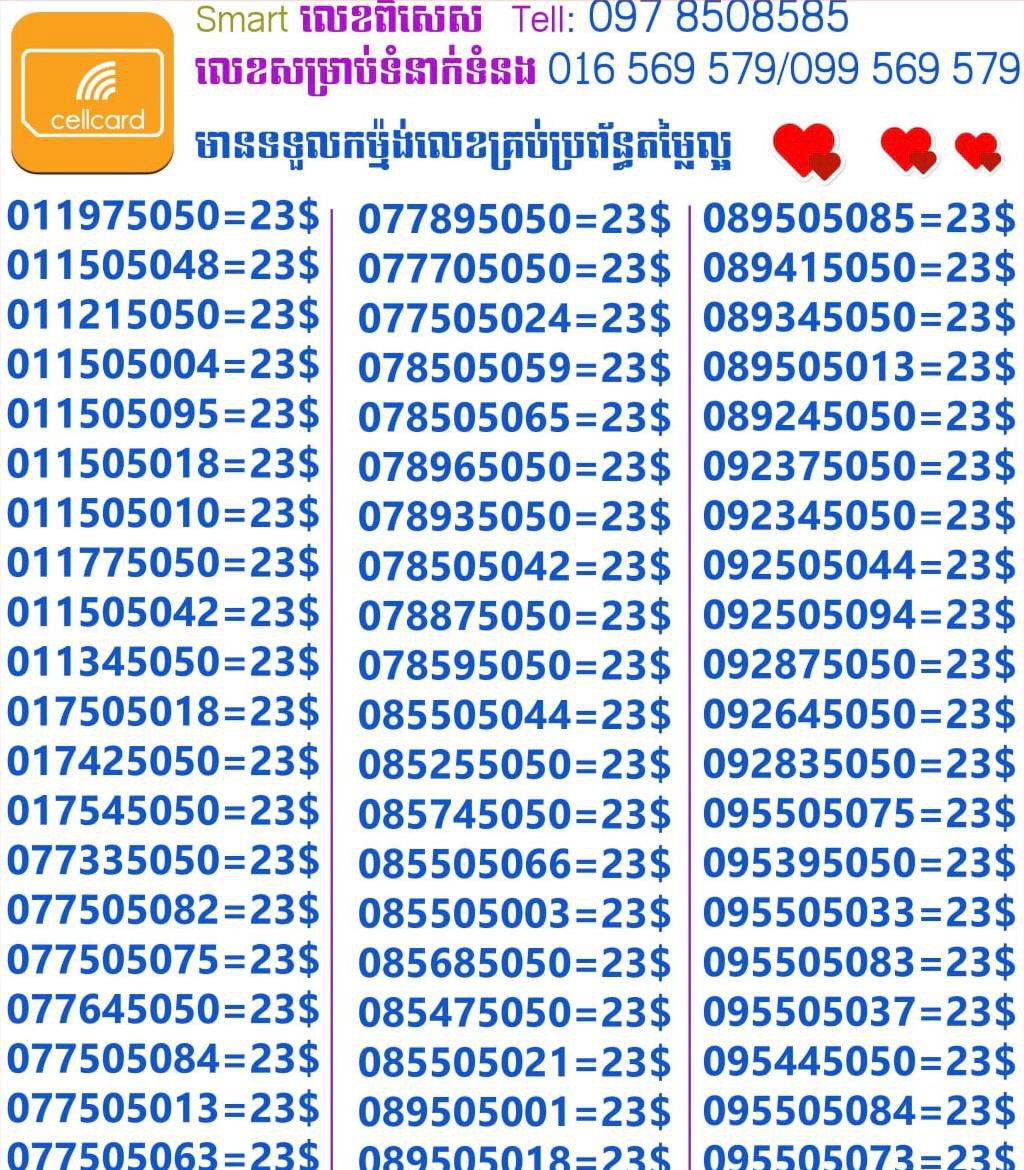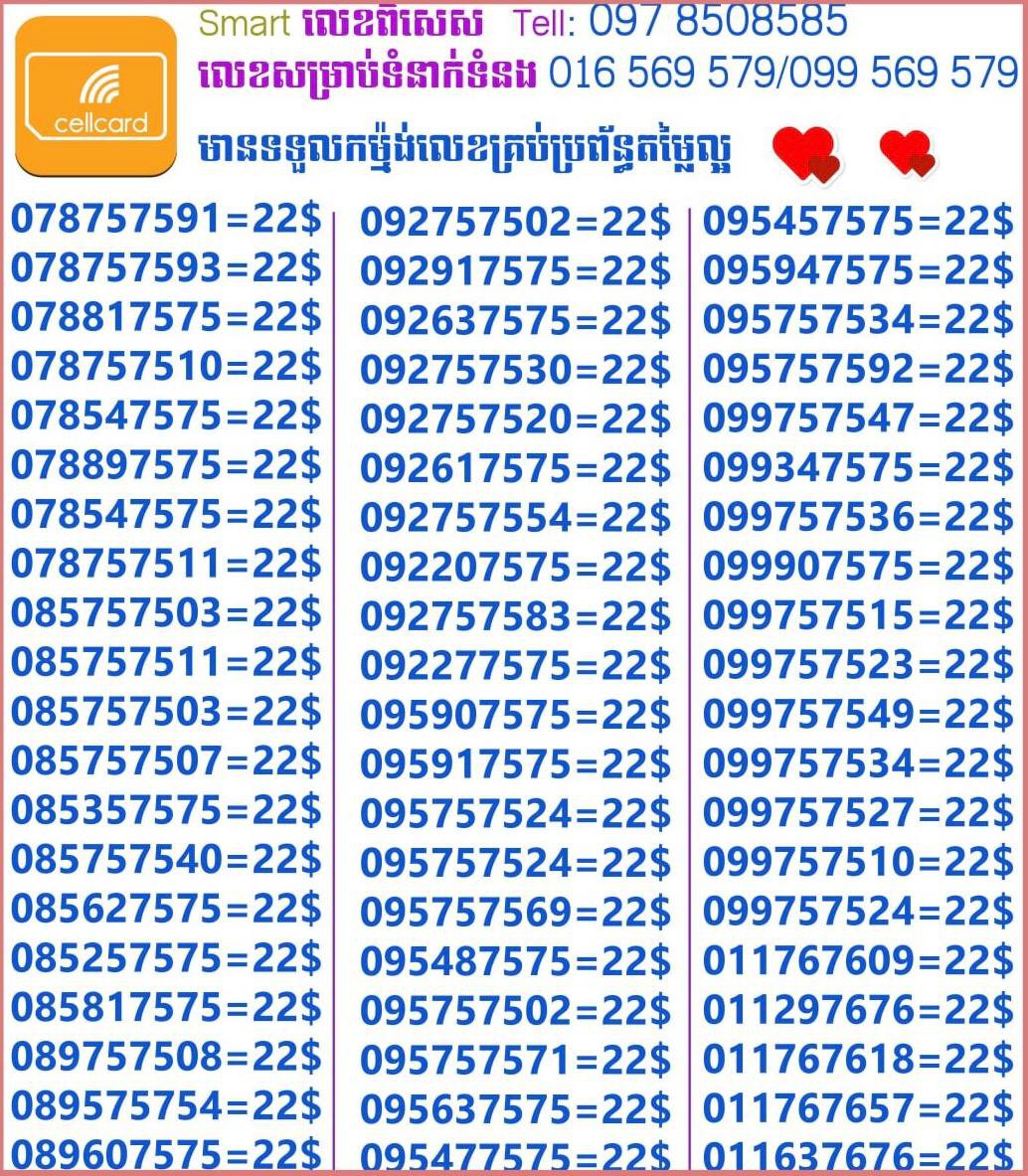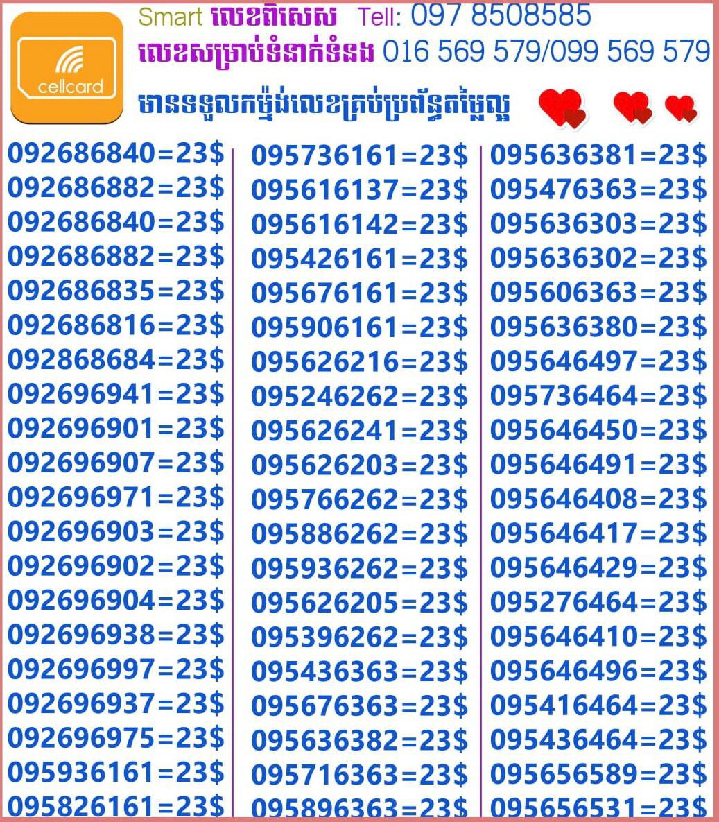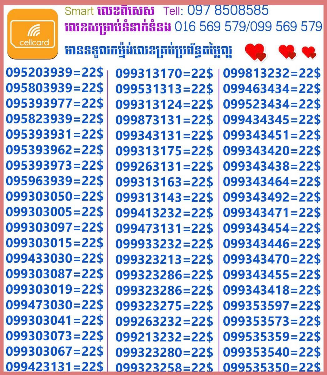 - ស៊ីមទើបមកដល់ថ្មីបងៗ អាចចូលមើលបានតម្លៃសមរម្យ មានលក់ស៊ីមគ្រប់ប្រព័ន្ធអាចចូលមើលបានណាចា លេខពីគូរបីគូរទើបកាត់ចូល Smart+Cellcard +Metfone &Smart + Metfone , Smart + Cellcard
