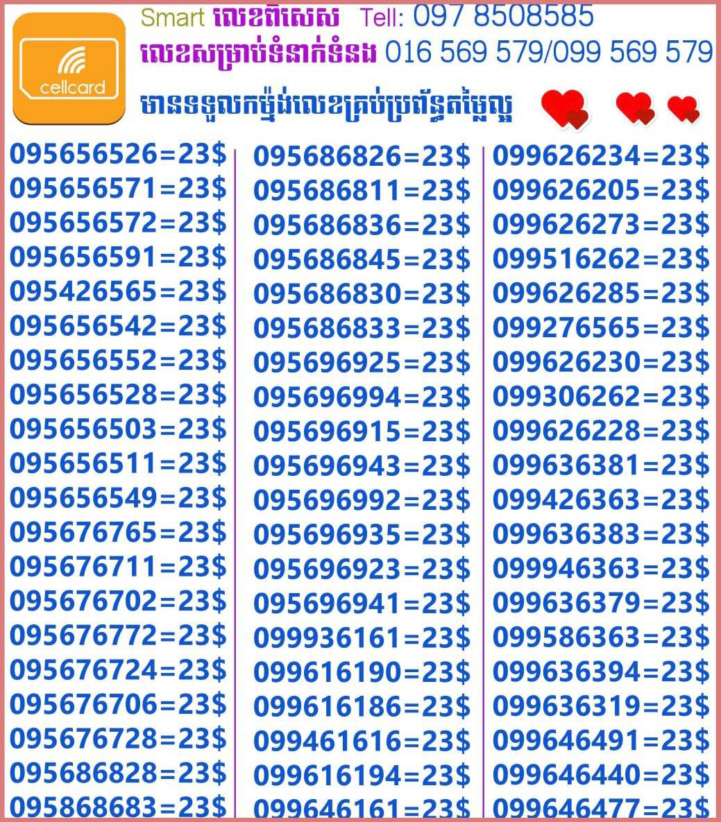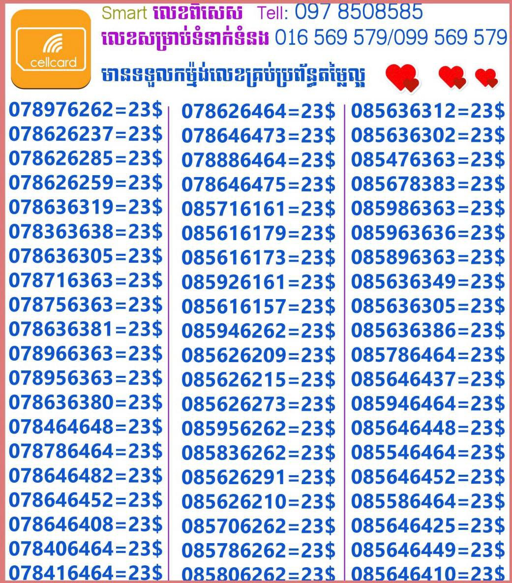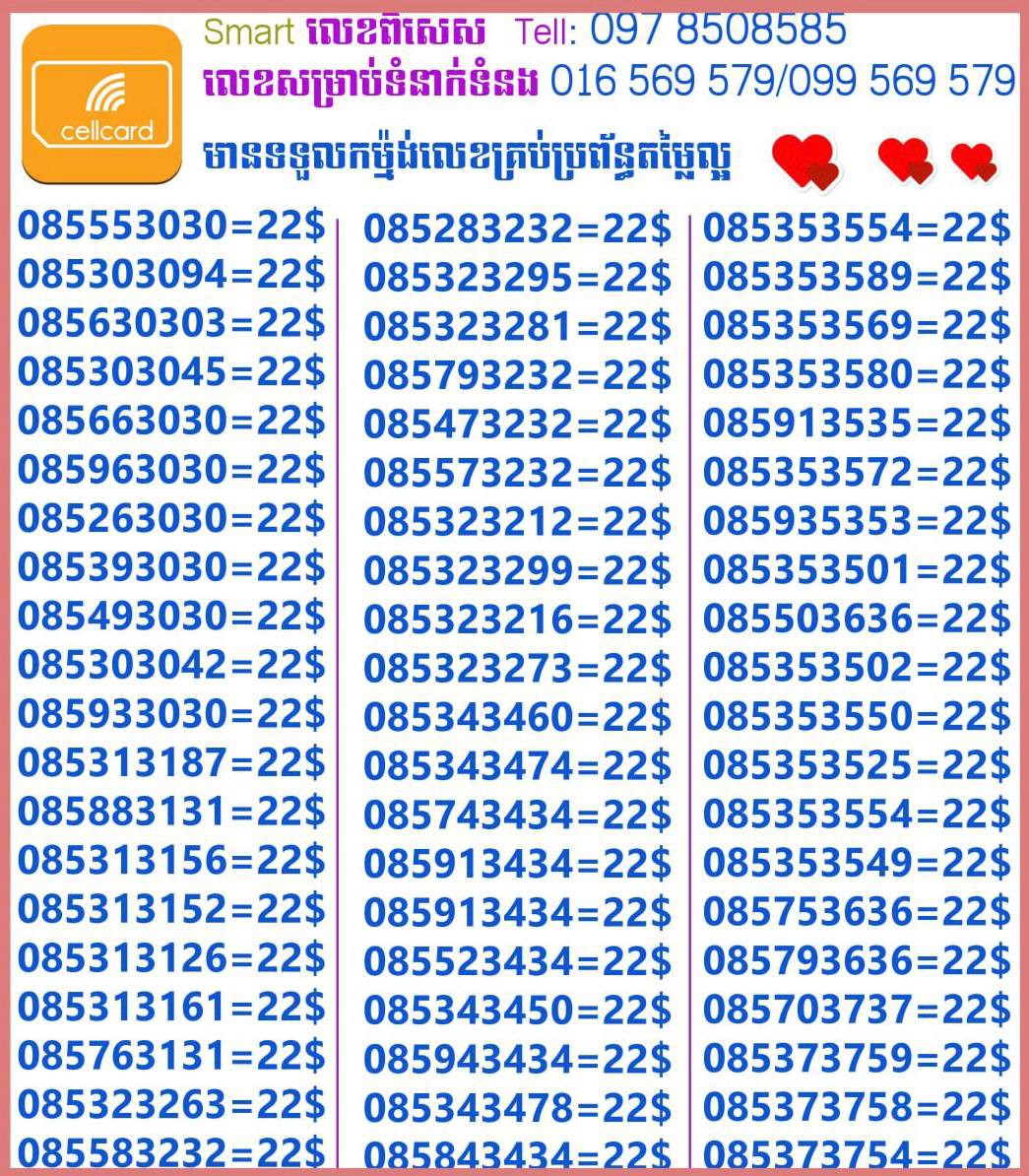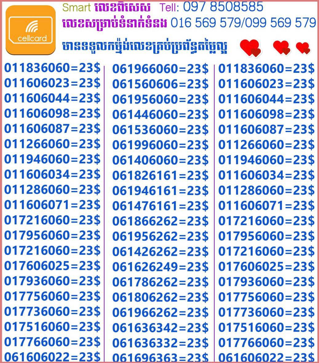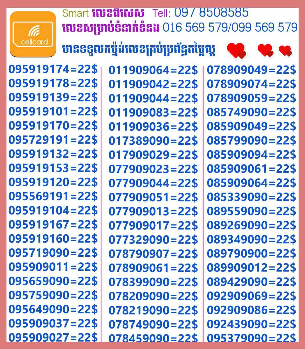- ស៊ីមទើបមកដល់ថ្មីបងៗ អាចចូលមើលបានតម្លៃសមរម្យ មានលក់ស៊ីមគ្រប់ប្រព័ន្ធអាចចូលមើលបានណាចា លេខពីគូរបីគូរទើបកាត់ចូល Smart+Cellcard +Metfone &Smart + Metfone , Smart + Cellcard