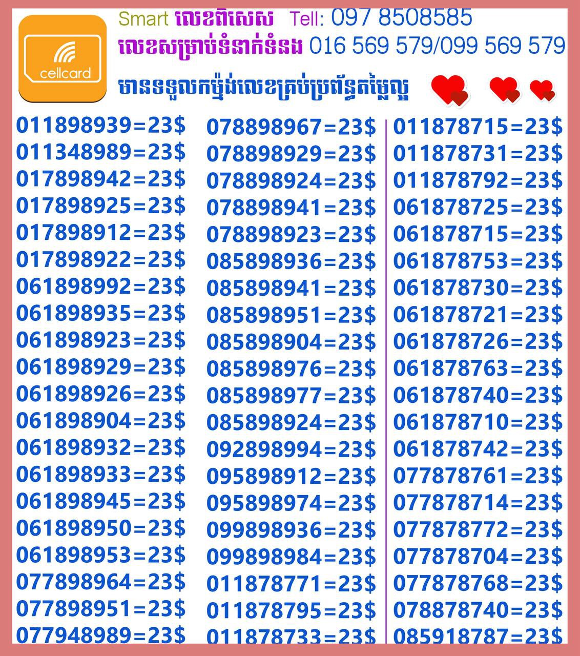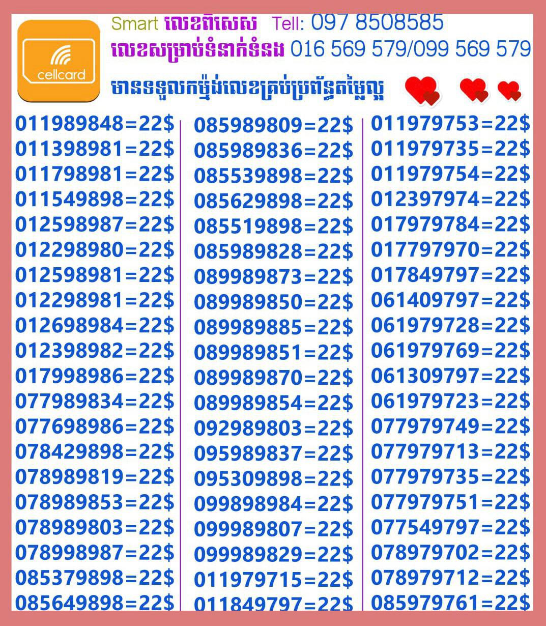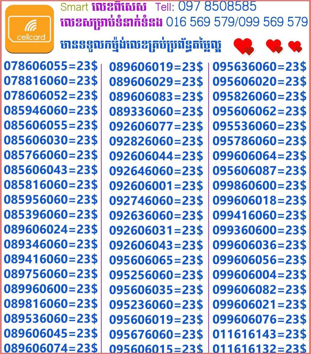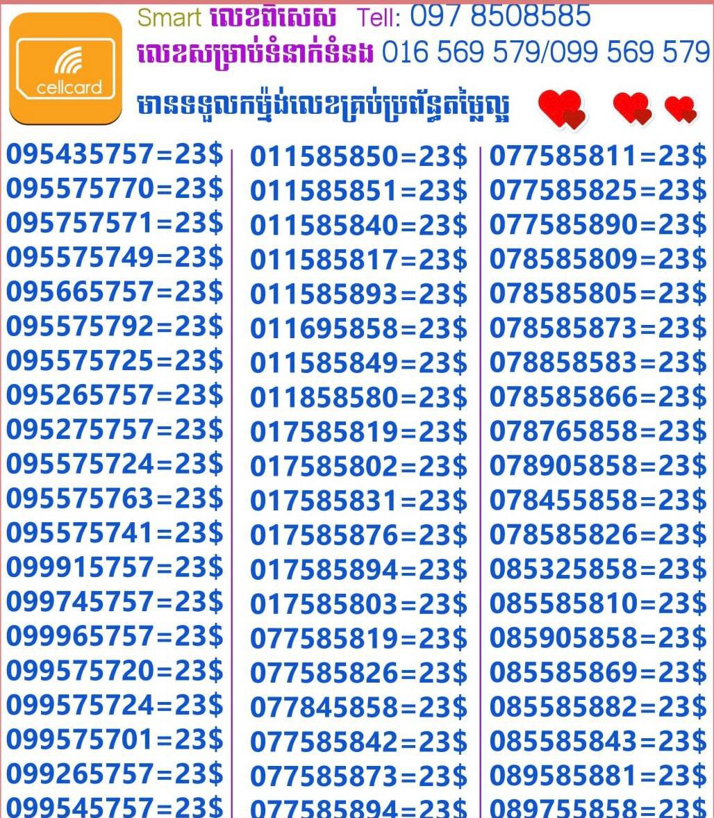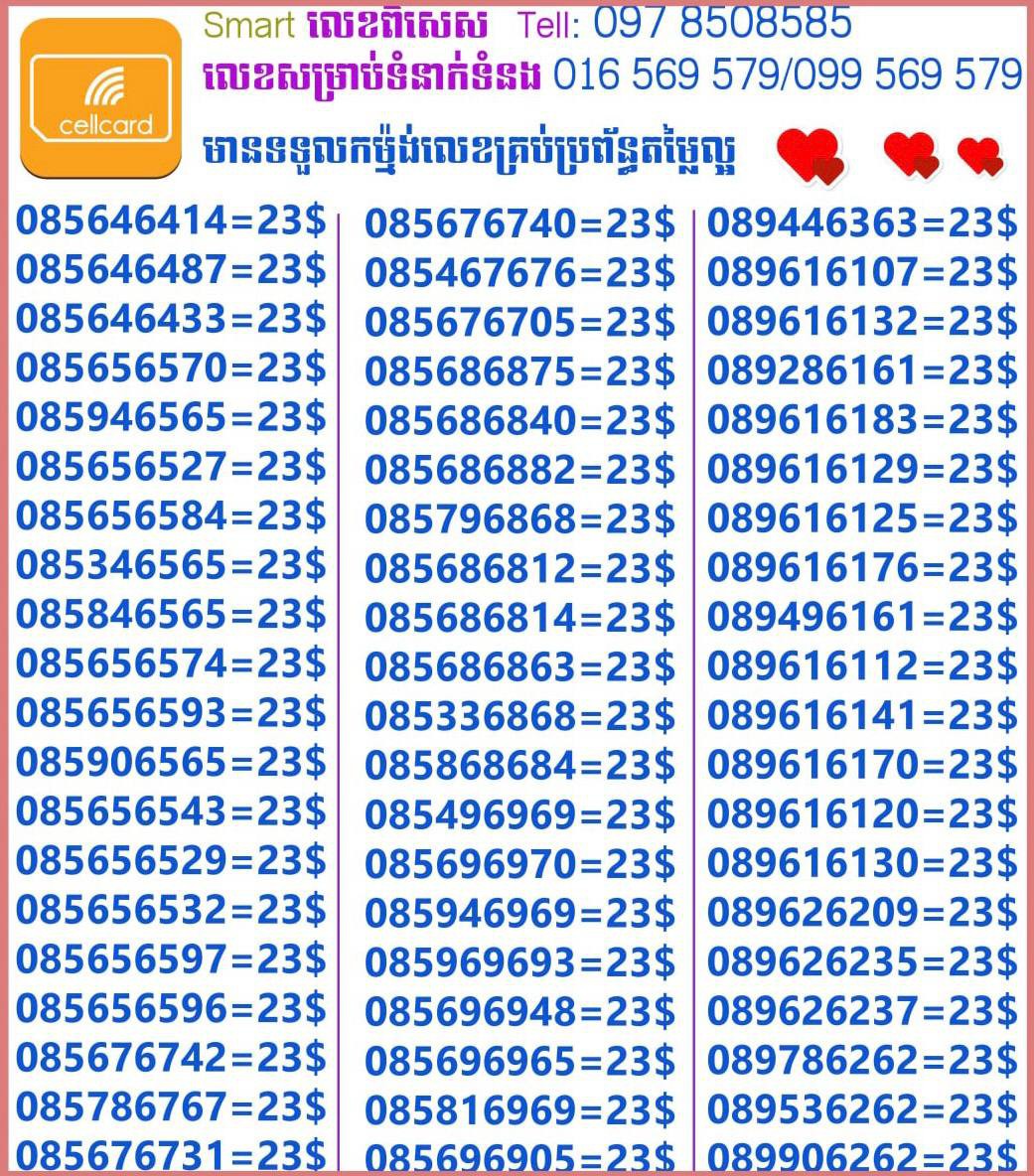 - ស៊ីមទើបមកដល់ថ្មីបងៗ អាចចូលមើលបានតម្លៃសមរម្យ មានលក់ស៊ីមគ្រប់ប្រព័ន្ធអាចចូលមើលបានណាចា លេខពីគូរបីគូរទើបកាត់ចូល Smart+Cellcard +Metfone &Smart + Metfone , Smart + Cellcard