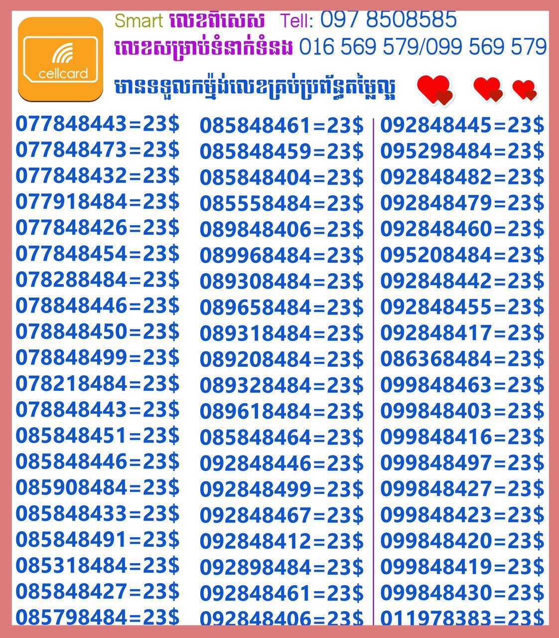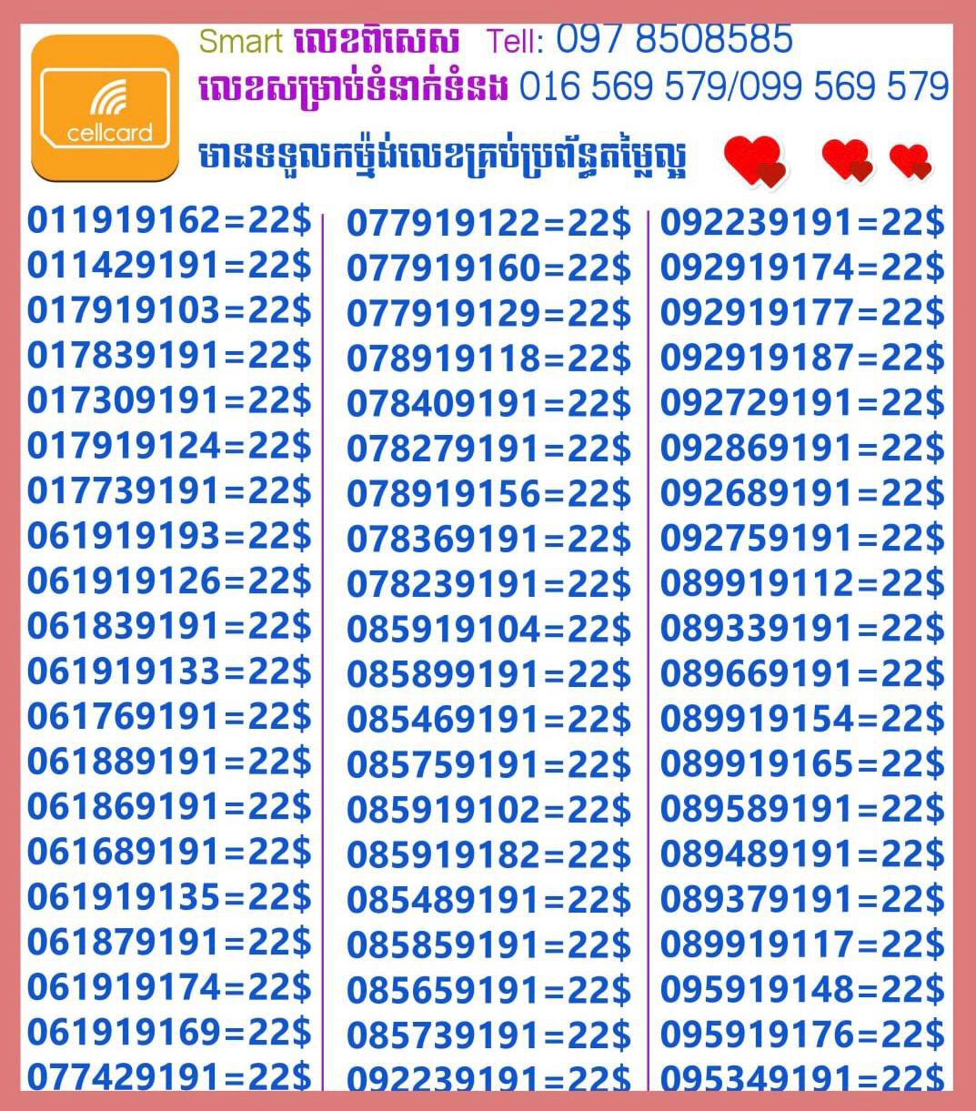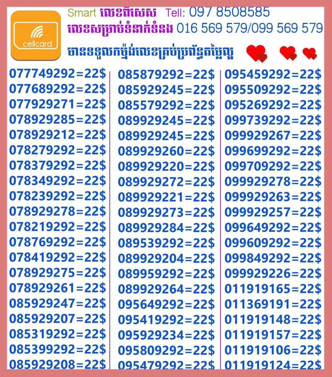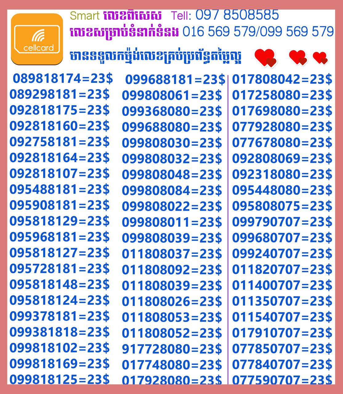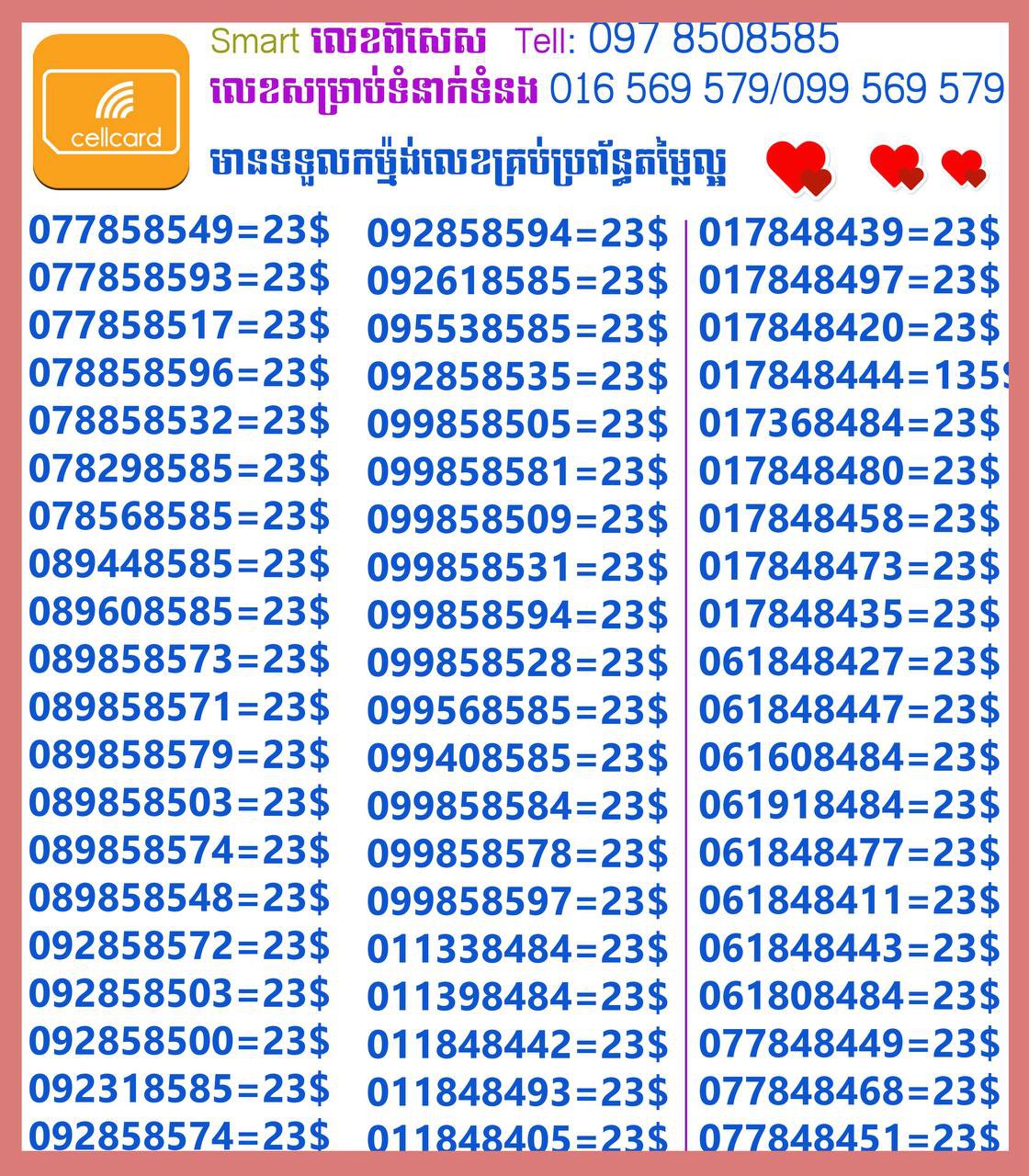 - ស៊ីមទើបមកដល់ថ្មីបងៗ អាចចូលមើលបានតម្លៃសមរម្យ មានលក់ស៊ីមគ្រប់ប្រព័ន្ធអាចចូលមើលបានណាចា លេខពីគូរបីគូរទើបកាត់ចូល Smart+Cellcard +Metfone &Smart + Metfone , Smart + Cellcard